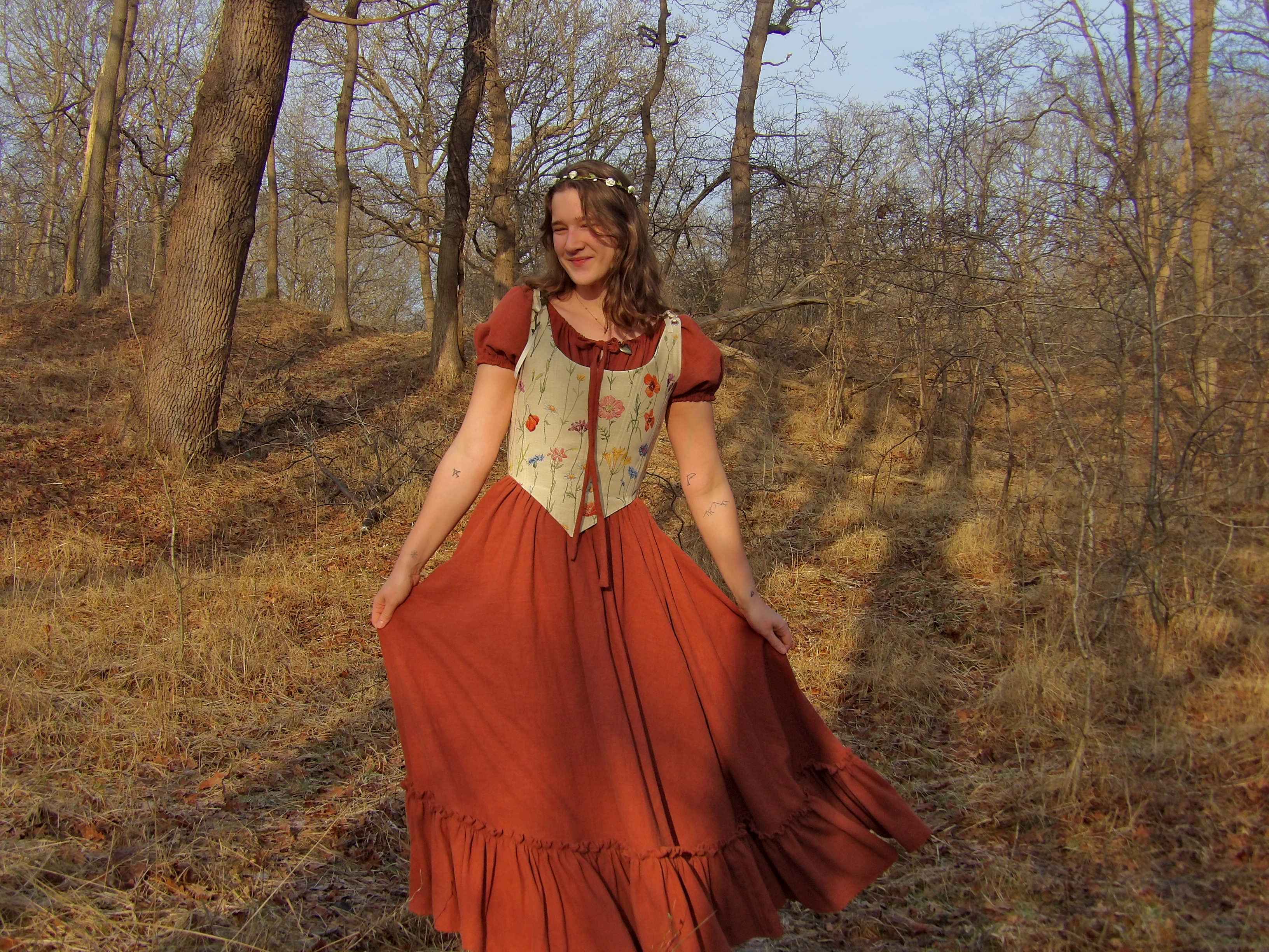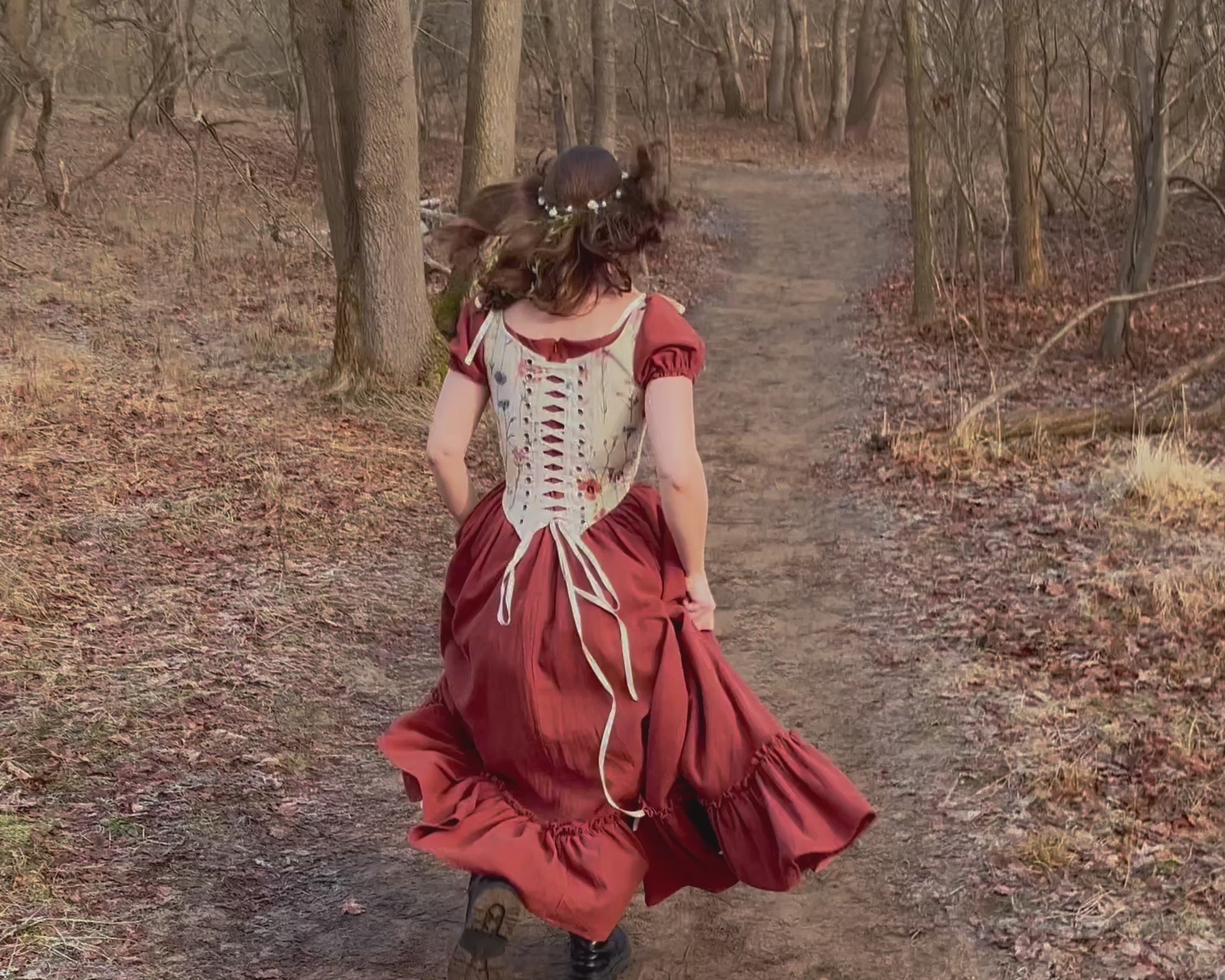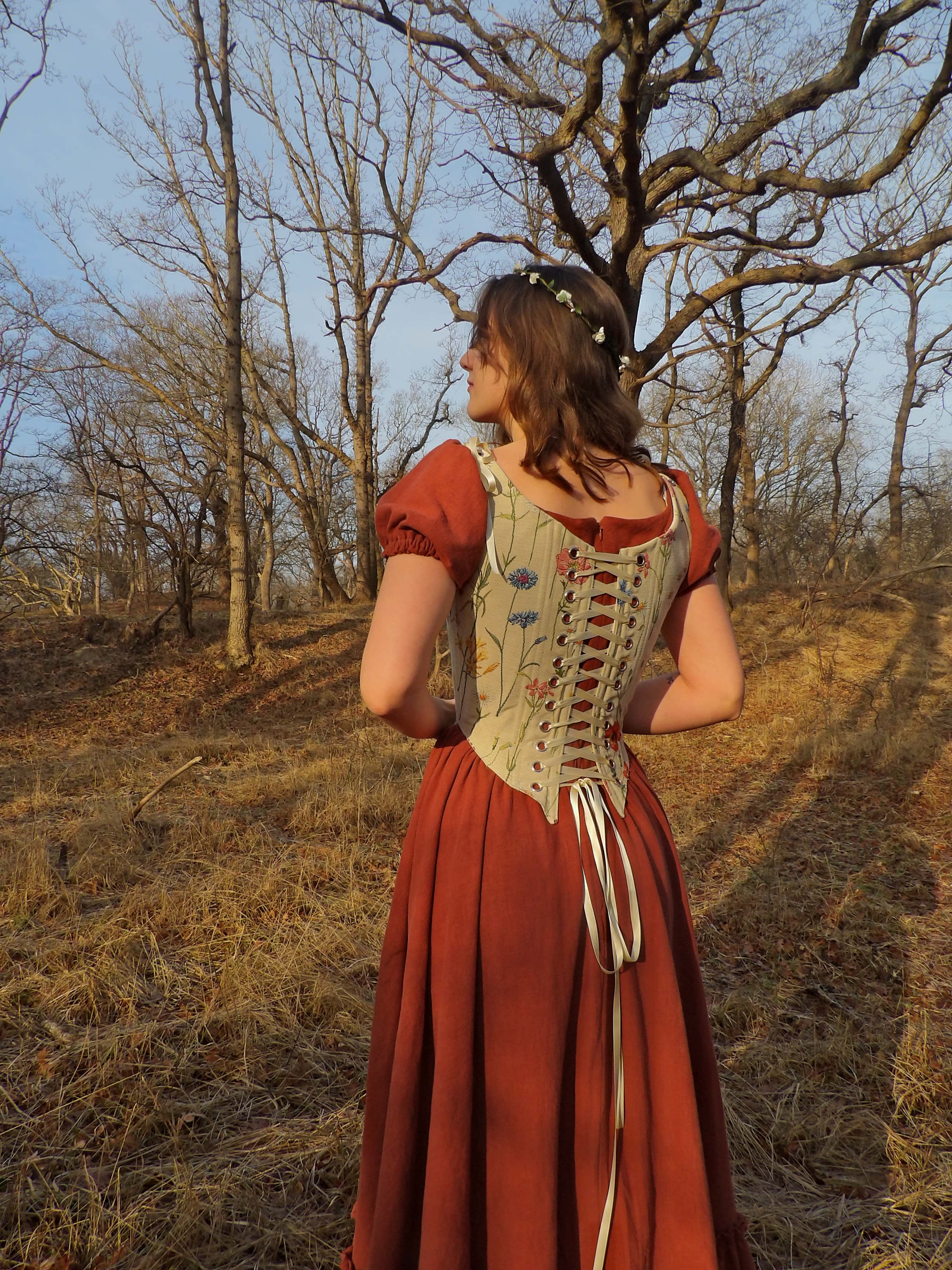 Een dromerig kostuum van 100% linnen met een bloemenmotief korset.