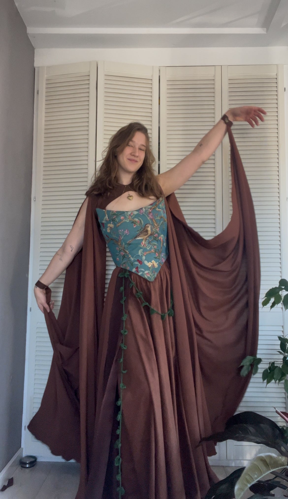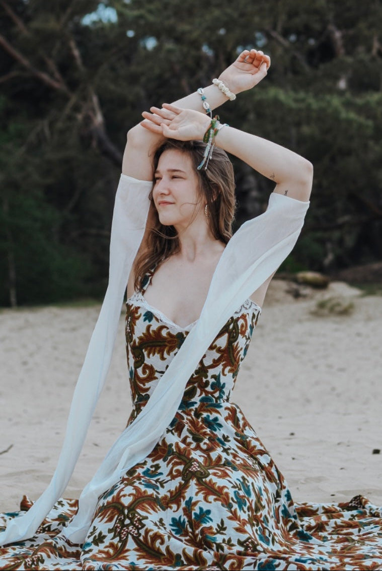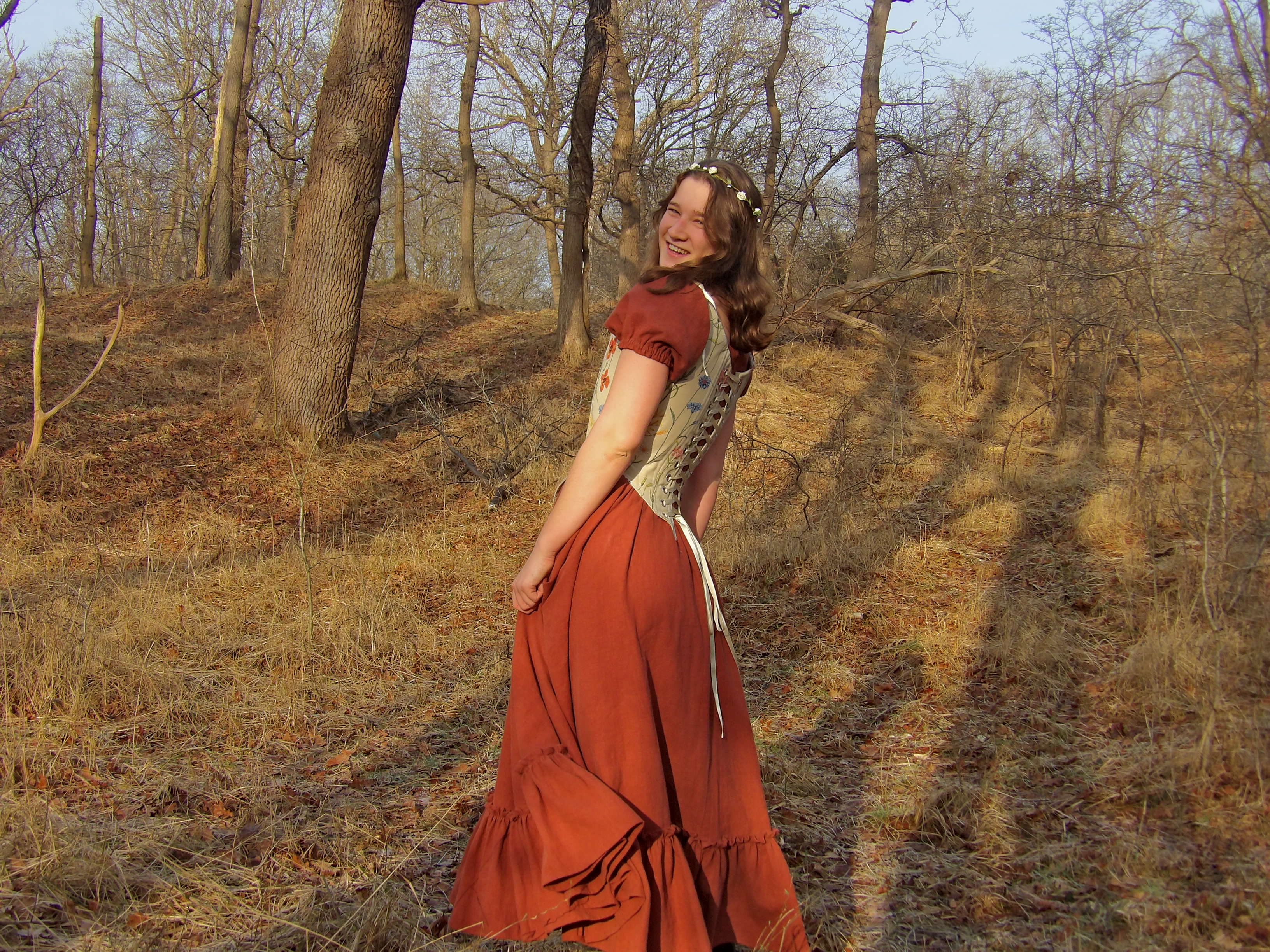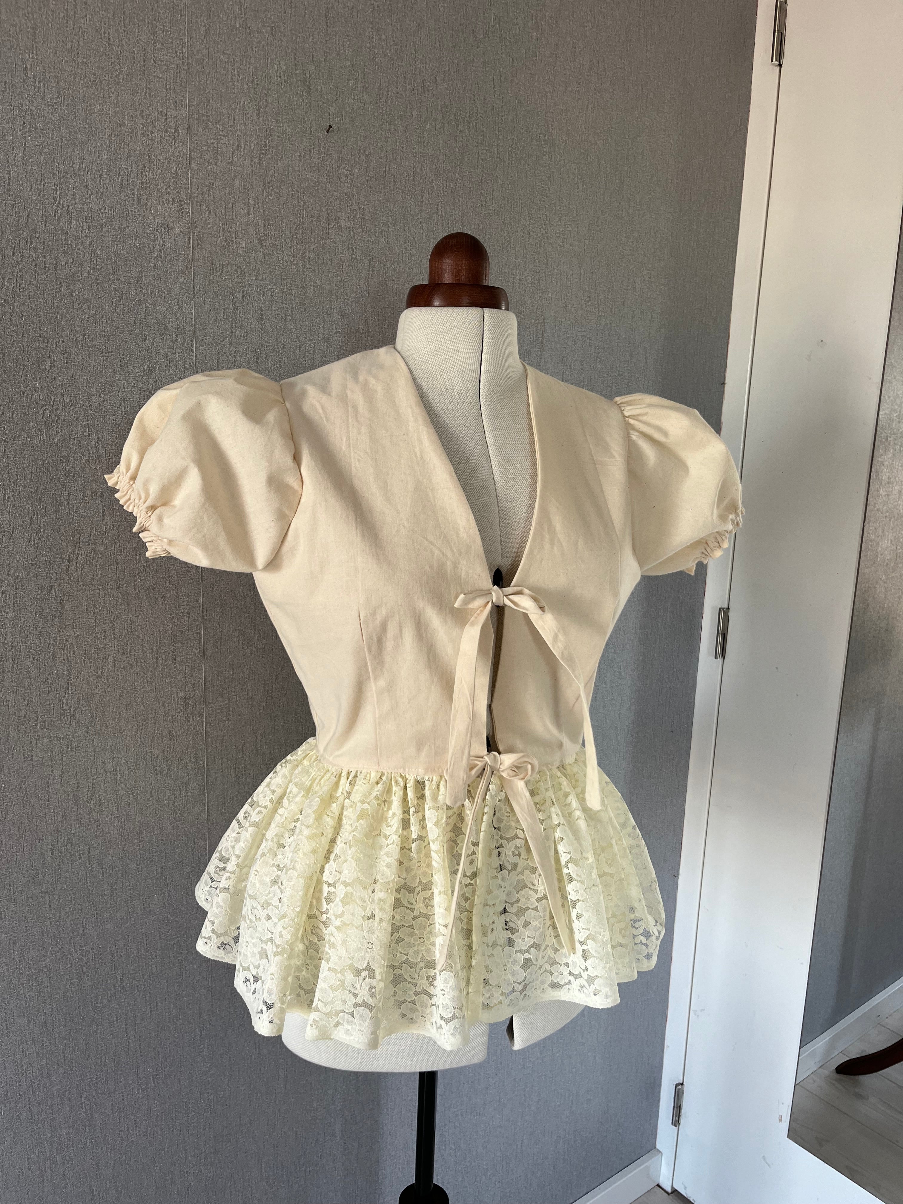 Een dromerig kostuum van 100% linnen met een bloemenmotief korset.